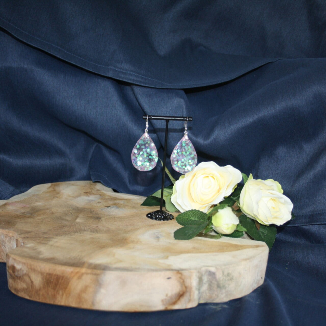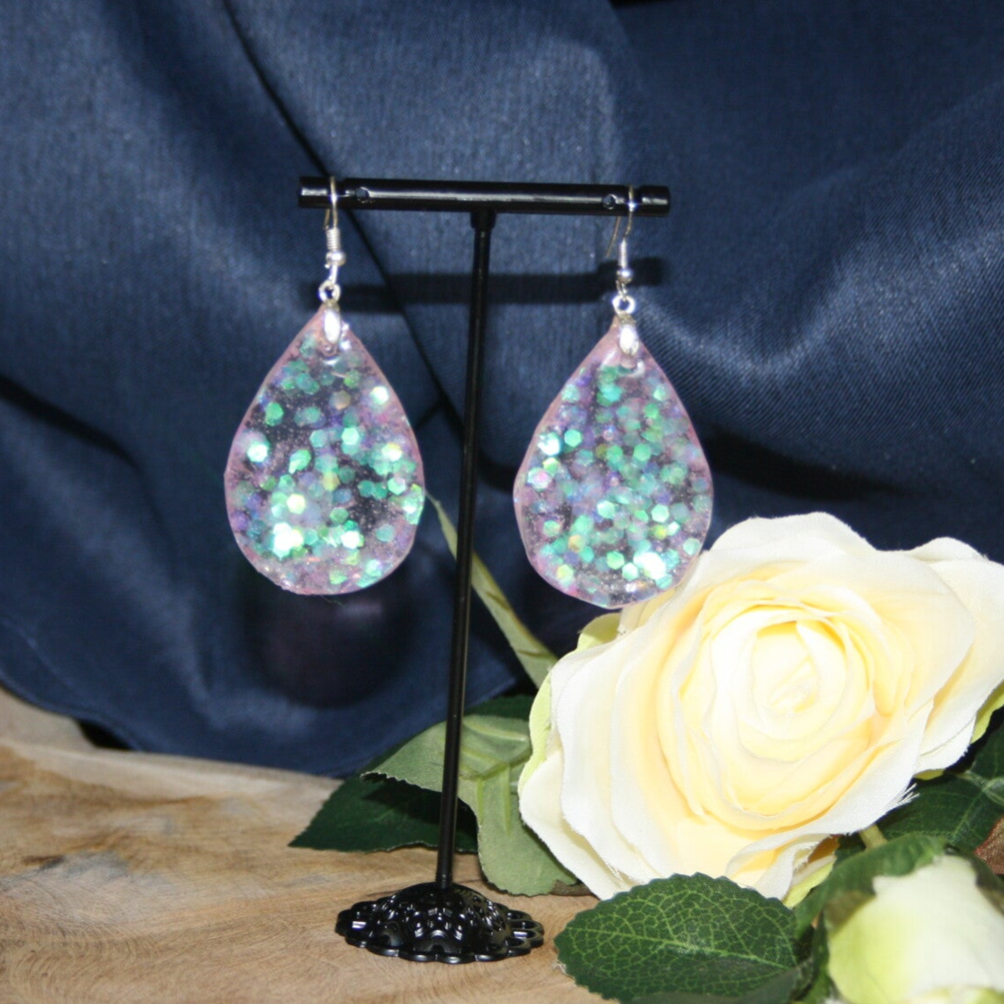 Unieke lichtroze glitteroorbellen gemaakt van epoxy.