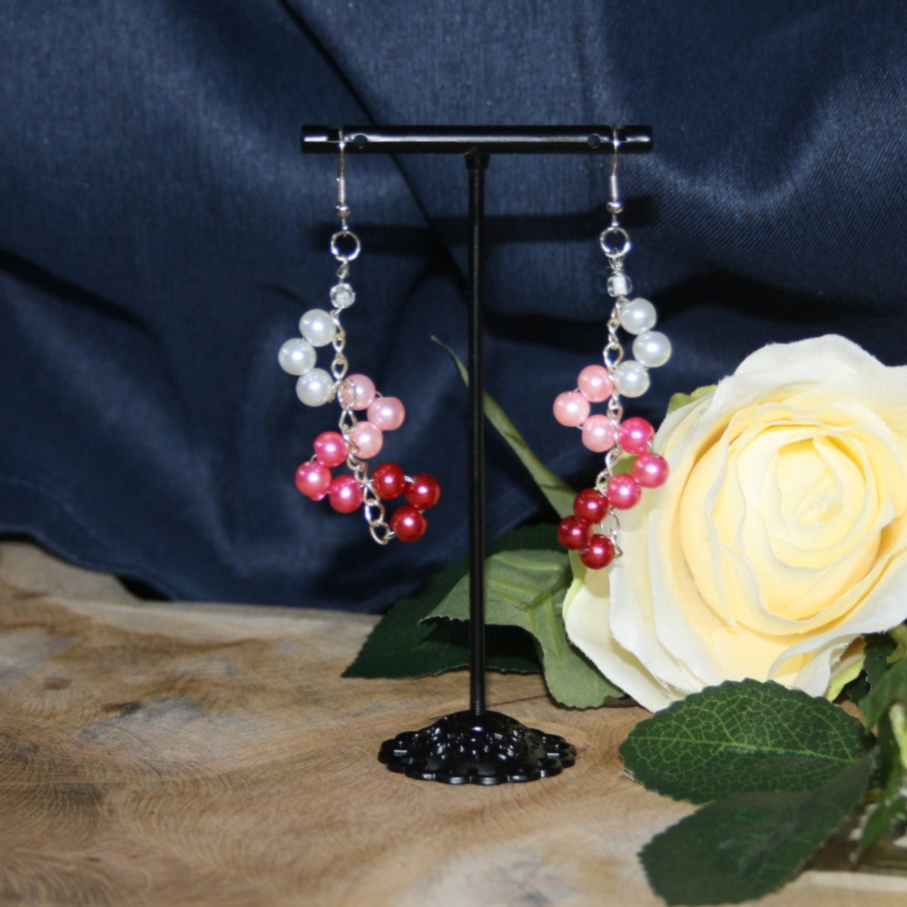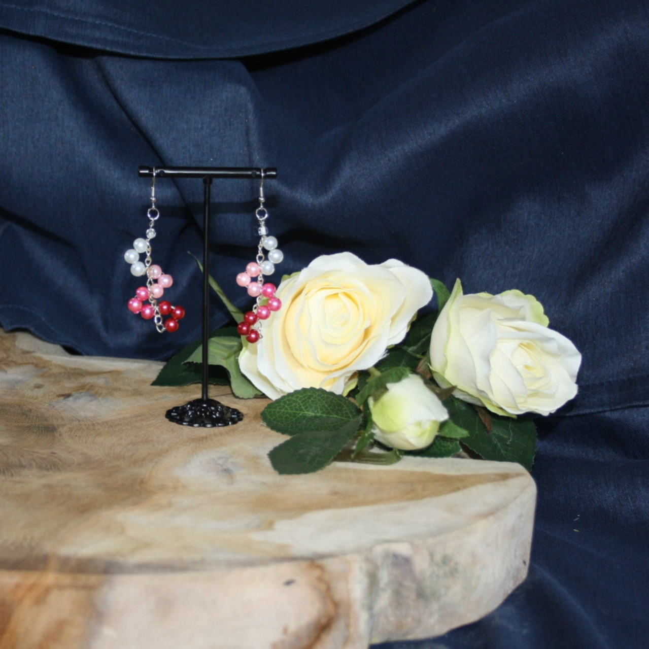 Unieke wit/lichtroze/fuchsiaroze kralen oorbellen gemaakt van ijzerdraad en glaskralen.