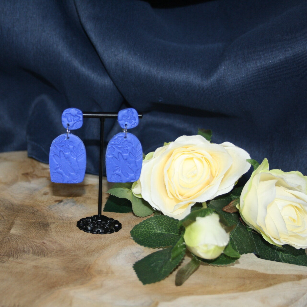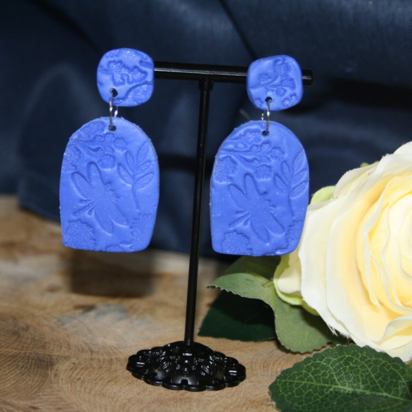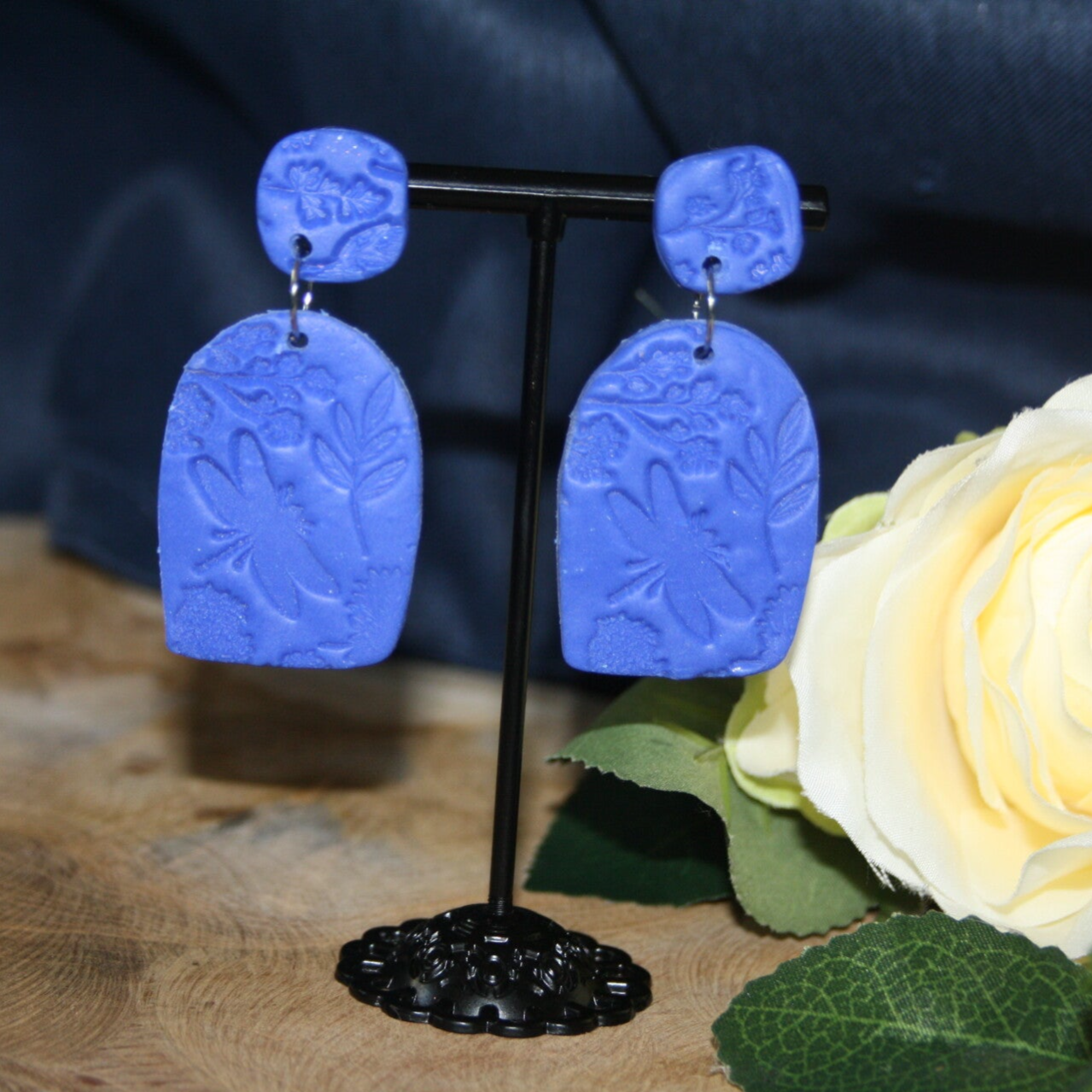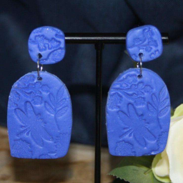 Unieke koningsblauwe schildvormige oorbellen met stempelafdruk van planten en libelle, gemaakt van fimoklei.
