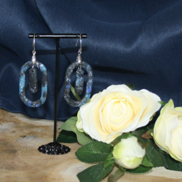 Unieke ovale oorbellen in blauw/zwart/zilver tint gemaakt van fimo klei.
