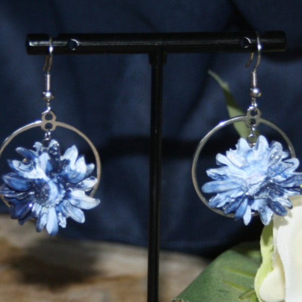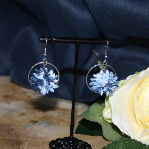 Unieke blauwe madeliefje oorbellen gemaakt van fimoklei.