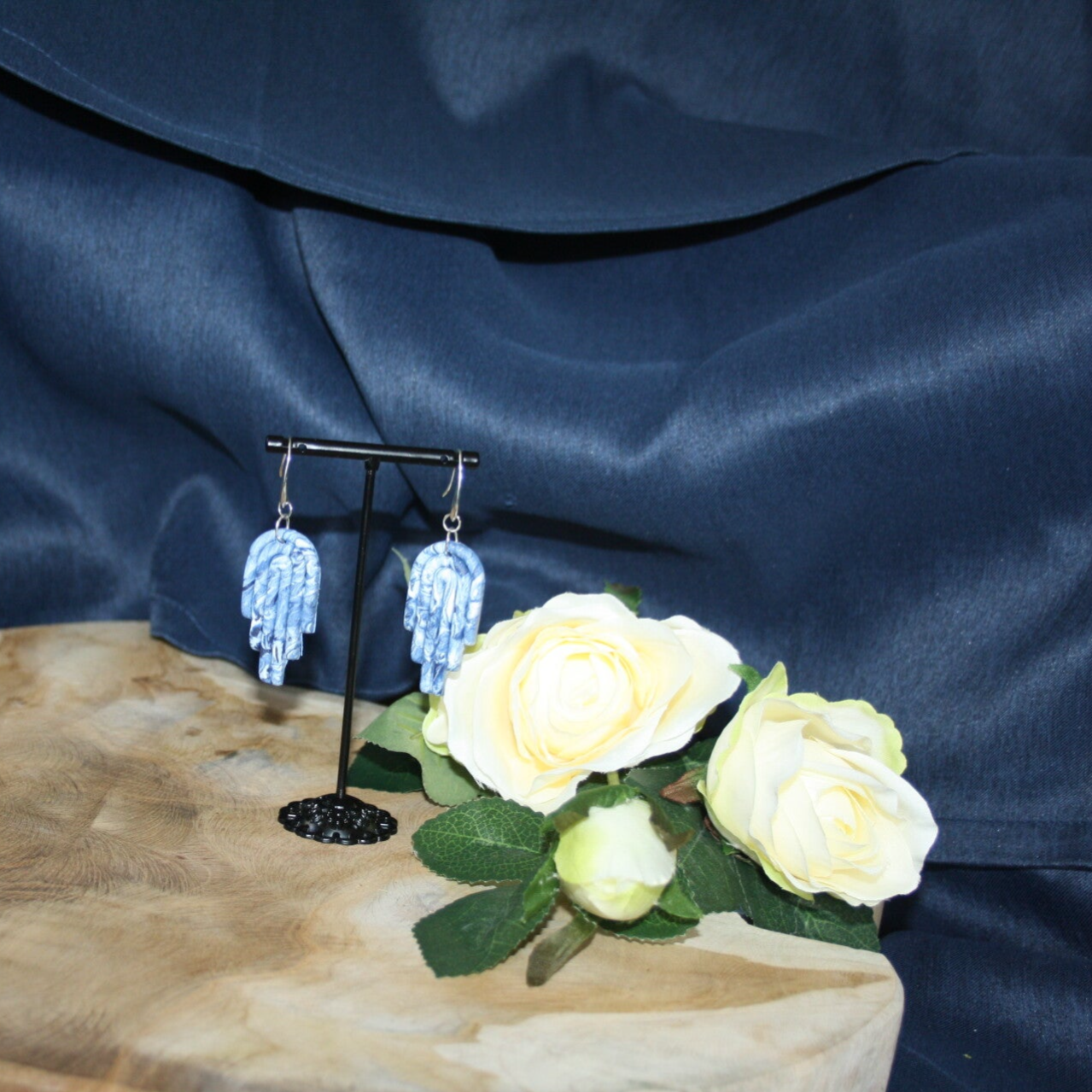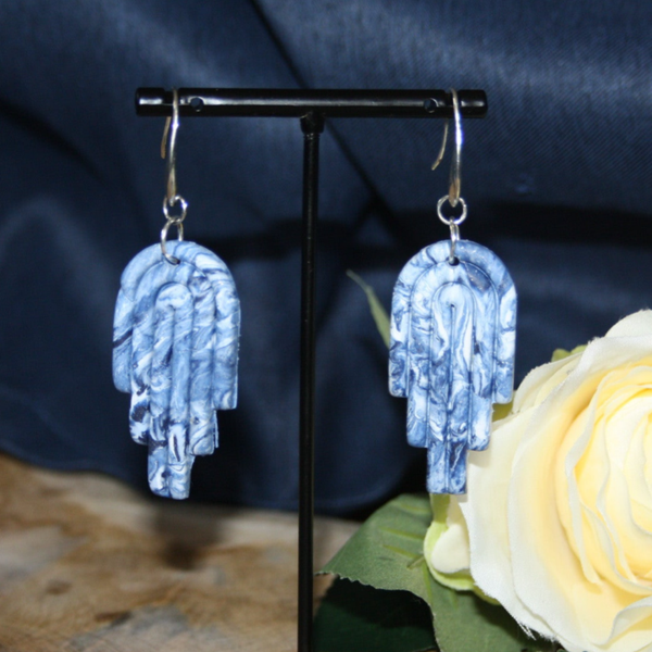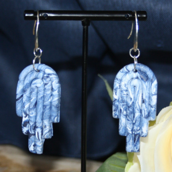 Unieke blauwtinten boogjesoorbellen gemaakt van fimoklei.
