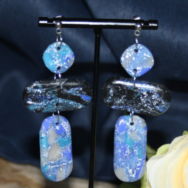 Unieke 3 delige blauw/zwarte oorbellen gemaakt van fimo klei.
