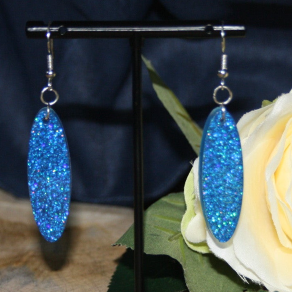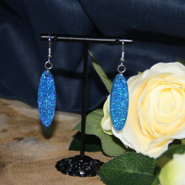Unieke ovale blauwe met glitter oorbellen gemaakt van epoxy.