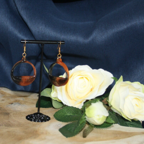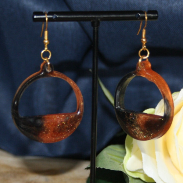 Unieke zwart/bruine ronde oorbellen gemaakt van epoxy.