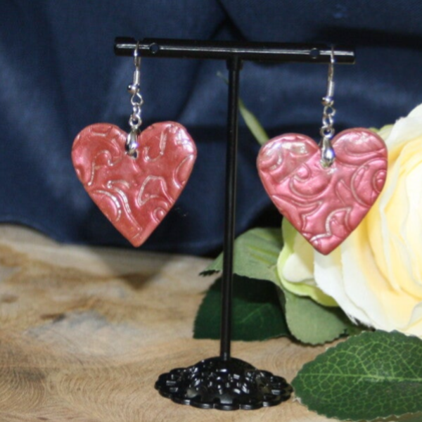 Unieke bruine bedrukte hartje oorbellen gemaakt van fimo kleien afgewerkt met een laagje epoxy.