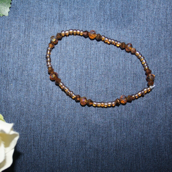 Dit handgemaakte armbandje is van rekbaar nylondraad en met grote en kleine bruine glaskralen