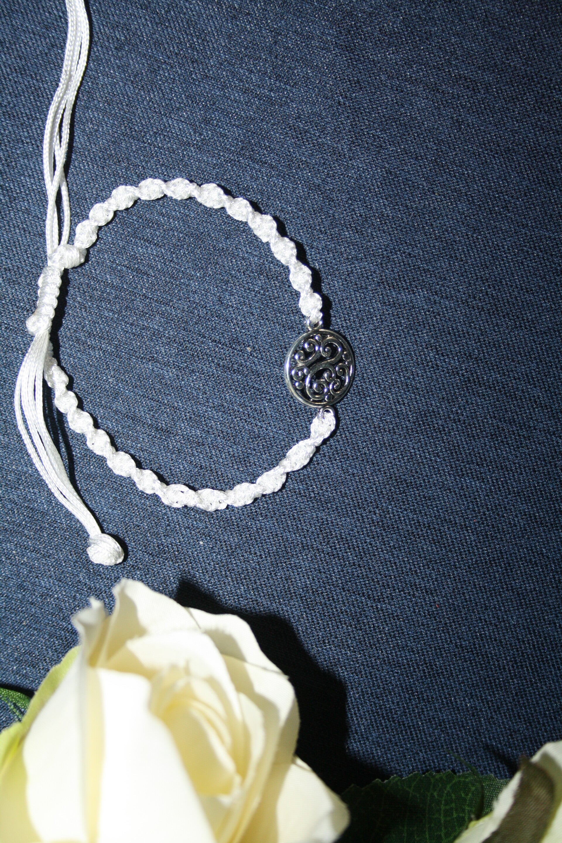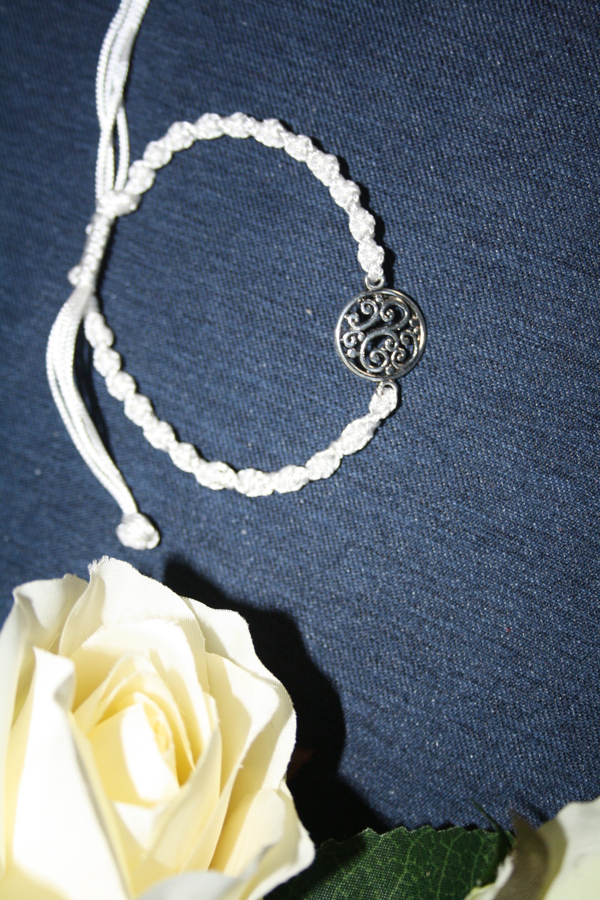 Dit handgemaakte armbandje is van wit nylondraad en heeft een ronde "levensboom"bedel. Door de aanpasbare sluiting bijna voor iedere pols geschikt.