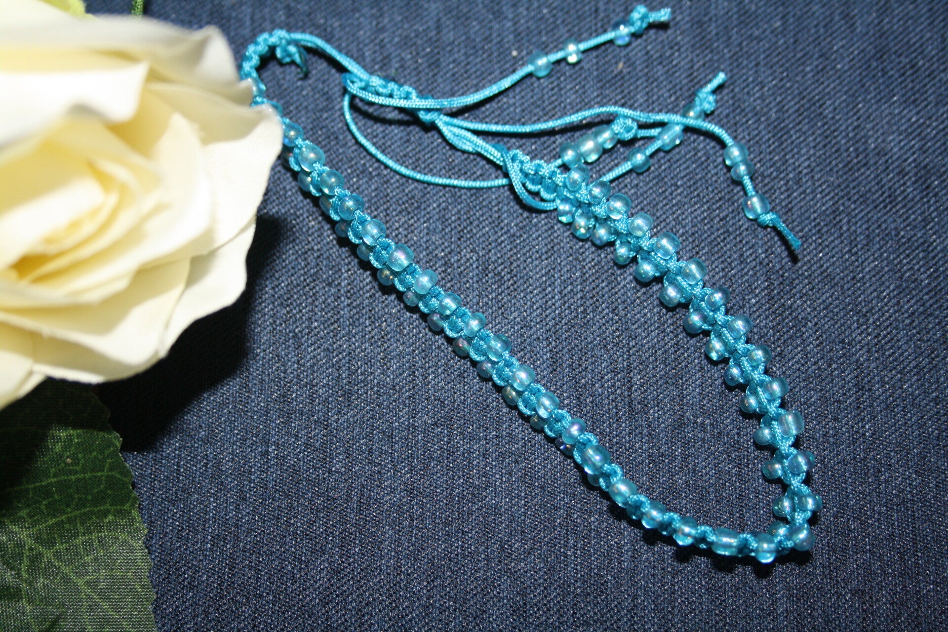 Dit handgemaakte armbandje is van blauw nylondraad en heeft aan de zijkanten kleine blauwe glaskralen. Door de aanpasbare sluiting bijna voor iedere pols geschikt.